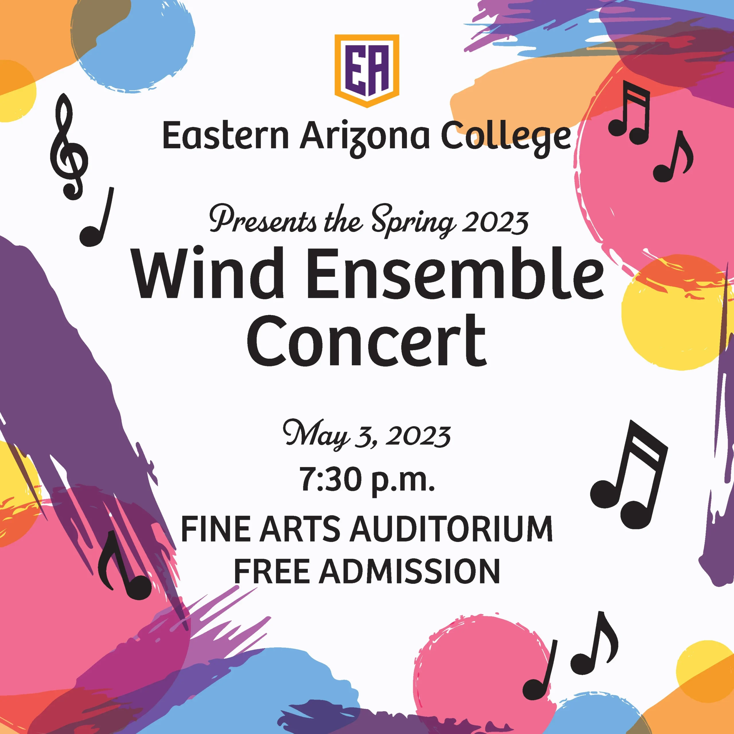 Eastern Arizona College is pleased to announce the spring Wind Ensemble (formerly Symphonic Band) concert on Wednesday, May 3, at 7:30 p.m., in the Fine Arts Auditorium. Admission is free for all music lovers to come and enjoy!