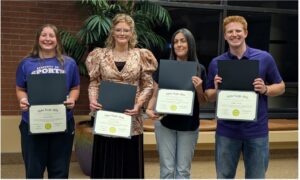 The evening concluded with five students being inducted into the Beta Zeta Chapter of Sigma Kappa Delta, the national English honor society, in the chapter’s 12th annual ceremony. Pictured here from left to right are Jordan Rose, Cheyanne Blasi, Nancy Fontaine, and Ethan Lauer. Not pictured: Aliyah Mitchell. [EAC – submitted photo.]
